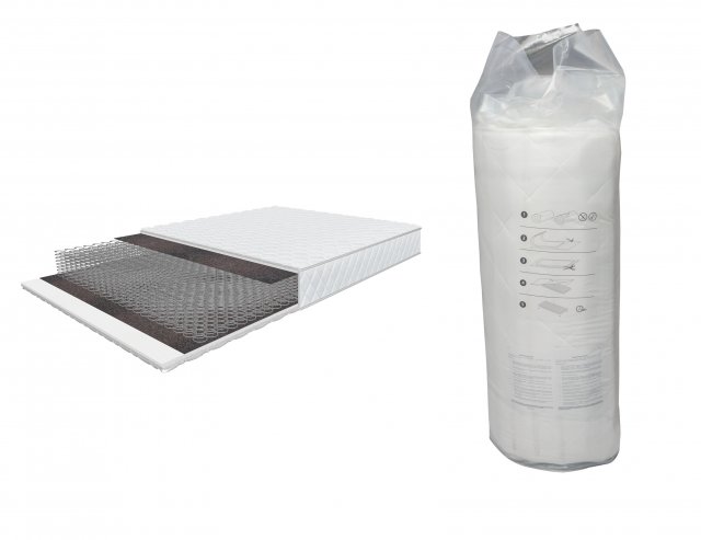 - По обеим сторонам матраса белое трикотажное полотно плотностью 200 г / м2, простеганное пенополиуританом толщиной 20 мм и спандондом.
